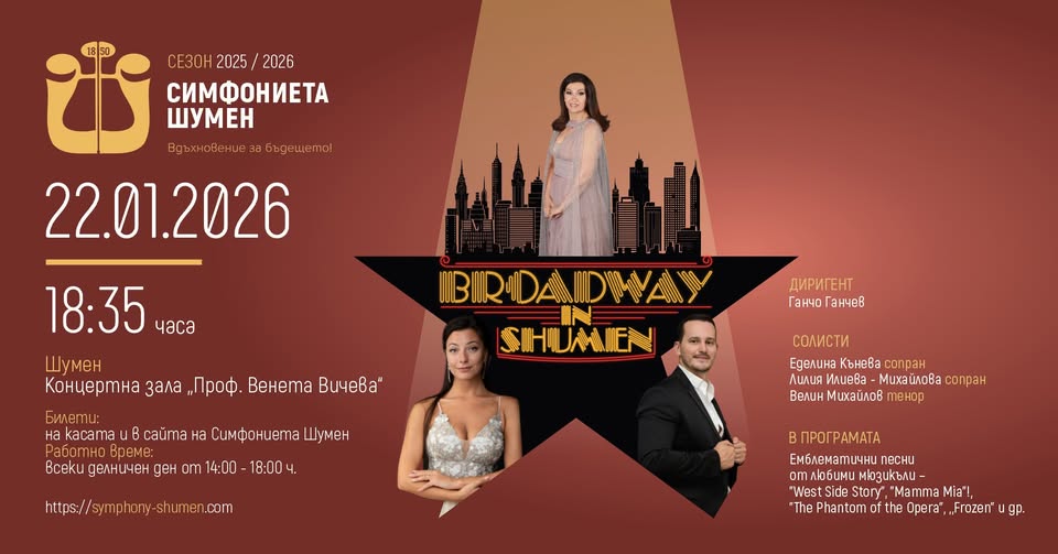 Уважаеми зрители, заповядайте на великолепен концерт с музика от Бродуей! Пренесете се във вълшебния свят на любимите си мюзикъли! 🎭…
