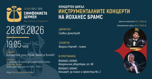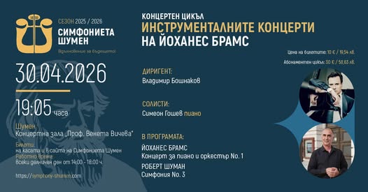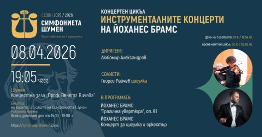 🎼 ИНСТРУМЕНТАЛНИТЕ КОНЦЕРТИ НА ЙОХАНЕС БРАМС📅 8 април 2026 | сряда | 19:05📍 Концертна зала „Проф. Венета Вичева“, ШуменСимфониета Шумен…