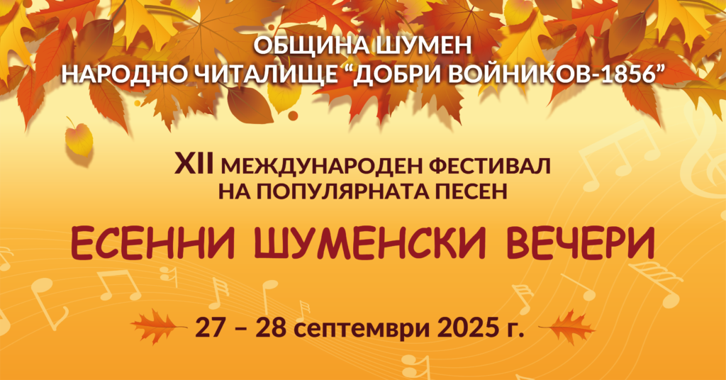 Please, be welcome on the 12th International Popular Song Festival “Autumn Evenings in Shumen”. Singers from Bulgaria, Ukraine and Moldova will compete between 10 AM and 5.30 PM. From 7.30 PM on Saturday evening, you can enjoy an explosive rock night.